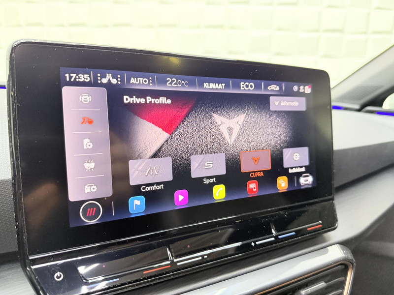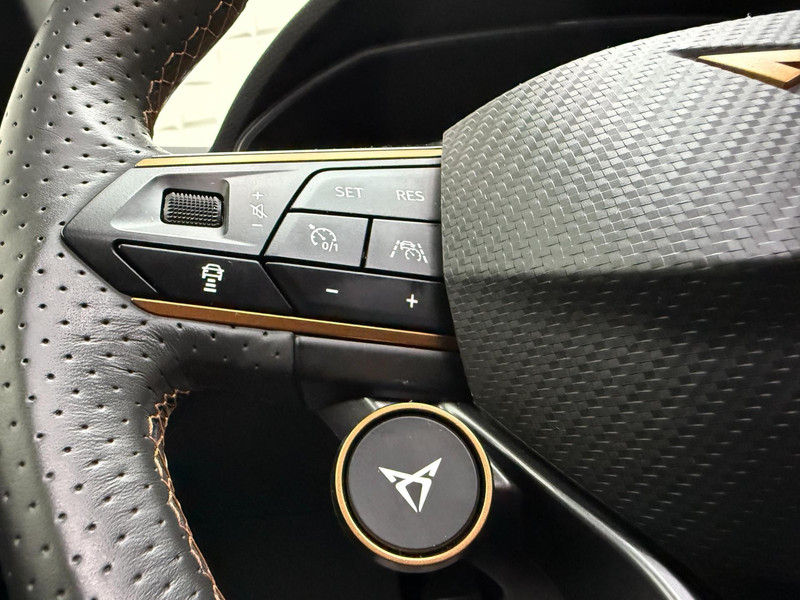Alle ritinformatie en communicatie is gebundeld in één overzichtelijk digitale dashboard. Altijd achter zicht, nooit meer nekkramp! De achteruitrijcamera maakt het supermakkelijk. Met adaptive cruise control houdt de auto zelfstandig afstand tot uw voorligger. Een veiligheidsverhogende optie waarmee u comfortabel onderweg bent. Veilig en comfortabel rijden wordt nog eens versterkt door Connected Services, zodat u diverse vitale functies van de auto altijd kunt checken in de app. Een optie die de veiligheid verhoogt, is de bediening vanaf het stuur van het audio-installatiesysteem (met DAB-radio!) en het origineel navigatiesysteem. Als u wilt kunt u beiden zelfs met uw stem bedienen. Met automatische airconditioning, draadloos opladen, regensensor, keyless entry, buitentemperatuurmeter en automatisch dimmende buitenspiegels is deze CUPRA helemaal compleet.