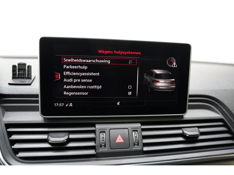 Zoals u mag verwachten van deze Audi Q5 is hij uitgerust met een reeks aan actieve veiligheidssystemen. Bij de veiligheidssystemen van deze Audi hoort ook de verkeersbord-detectie. Die leest tijdens het rijden als het ware met u mee en attendeert u op de significante verkeersborden langs en boven de weg. Kop-staartbotsingen vormen een belangrijk deel van de meest voorkomende aanrijdingen. De forward collision warning van deze auto voorkomt zulke botsingen geheel of reduceert de ernst van de schade aanzienlijk. Ook is deze auto uitgerust met een systeem dat u waarschuwt wanneer u achter het stuur in slaap dreigt te vallen. Met voorzieningen als accident avoidance system, hill hold functie, brake assist en bandenspanningcontrolesysteem, bent u altijd veilig onderweg.